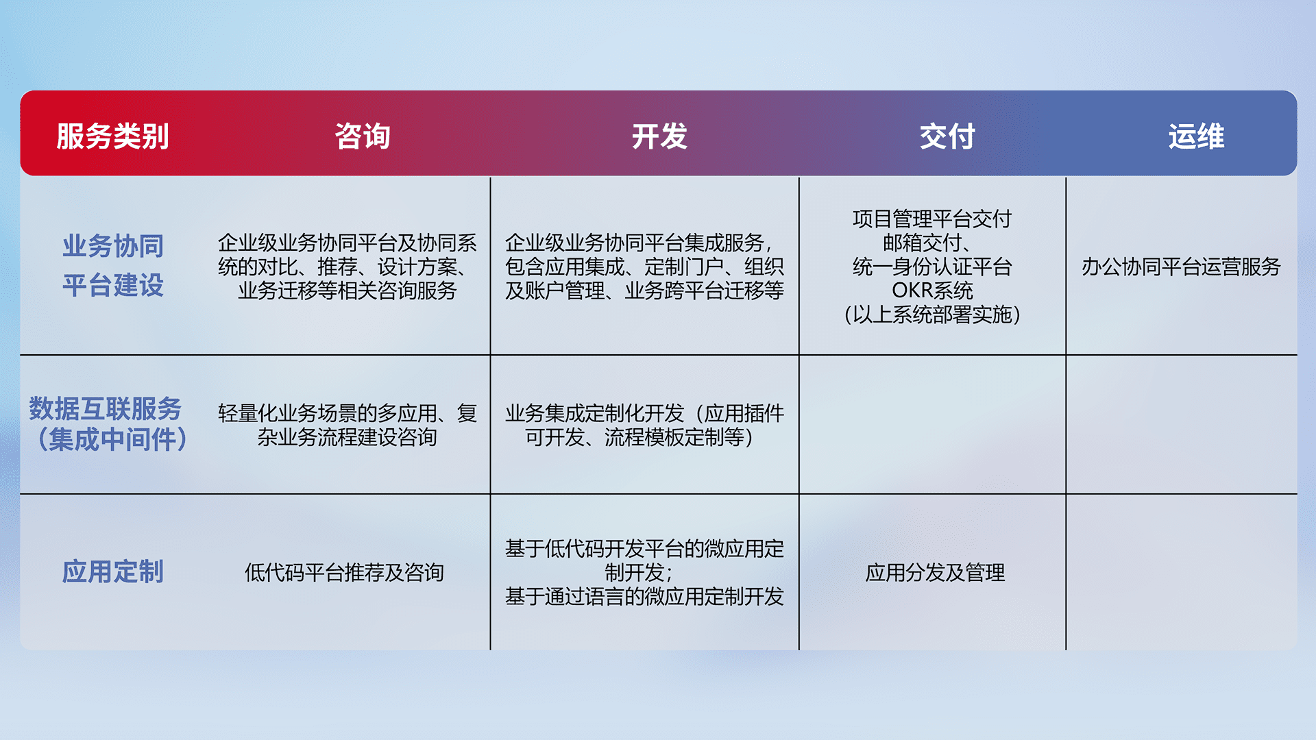 针对钉钉、、、、企微、、IDaas等平台级产品提供产品的规划、、方案、、、、交付、、、定制化开发等服务,,,,实现如统一协同办公、、智能客户服务、、、混合会议管理、、、、智能数据查询、、、等业务场景,,,,实现数字化转型。。。