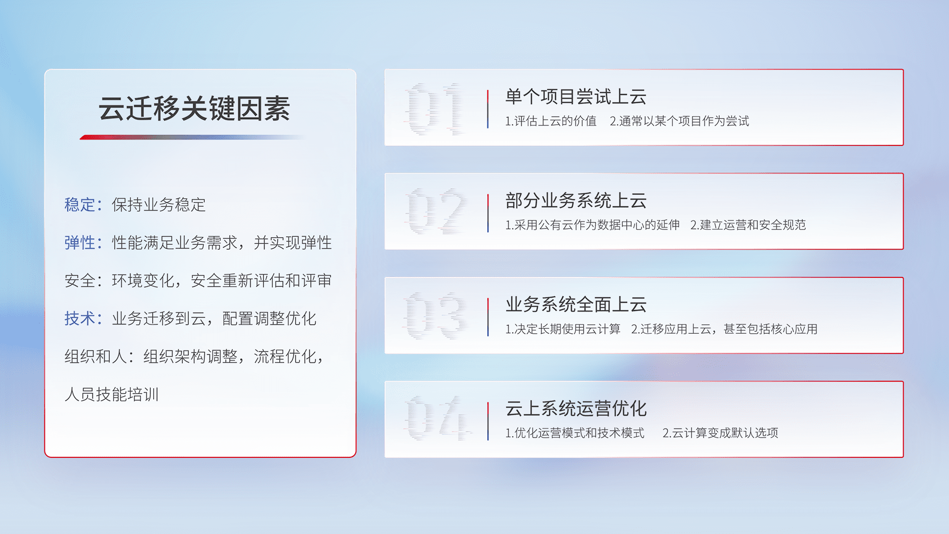 结合实际业务,,,,从规划设计、、、云平台选型、、、、云原生改造、、、数据迁移、、、集成交付,,,迁移全过程为客户识别最佳上云路径,,,做好风险识别管理,,,,设计网络架构、、、身份权限、、、安全审计合规、、、、操作审计、、日志审计、、、监控告警策略、、、多站点容灾设计等,,,,对云上基础设施进行整体规划,,提升IT治理水平,,,,以满足弹性、、高可用、、高性能的需求。。