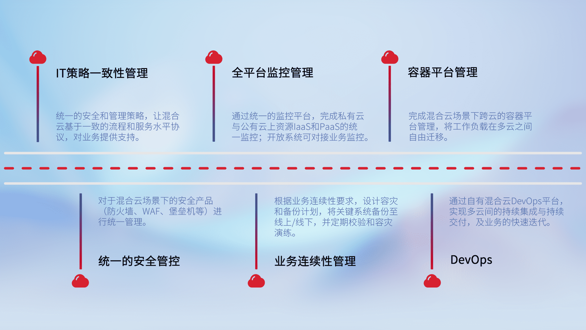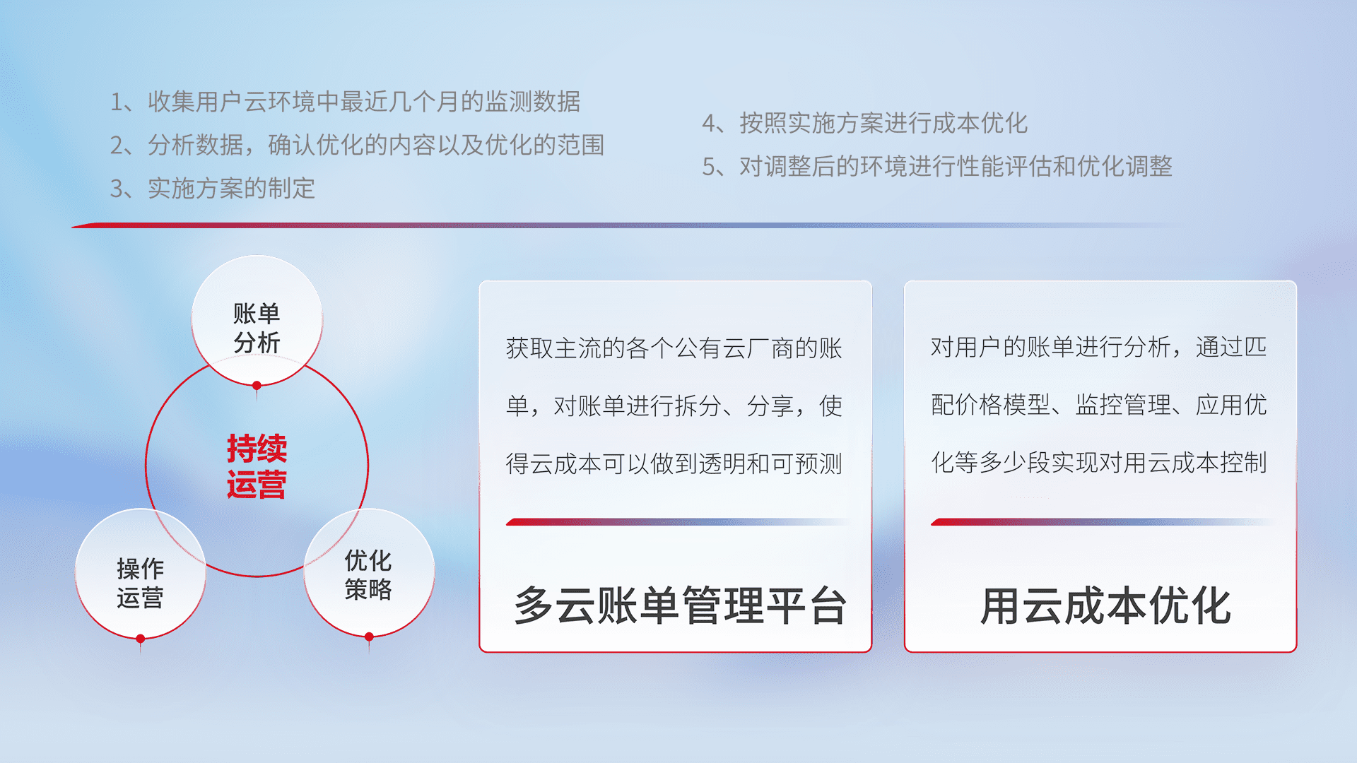 通过多云纳管,,,,以统一的资源数据模型把客户的云资源进行抽象和封装,,进而实现对多云资源的统一操作,,,保障云资源管理的可靠性、、稳定性与可用性。。。。量身定制化运维内容,,配置、、、、开发运维、、补丁管理、、备份、、、、监控、、、认证和访问管理、、、、审计和日常巡检等,,,保障在用云过程中的可靠度,,稳定度以及高可用率。。。