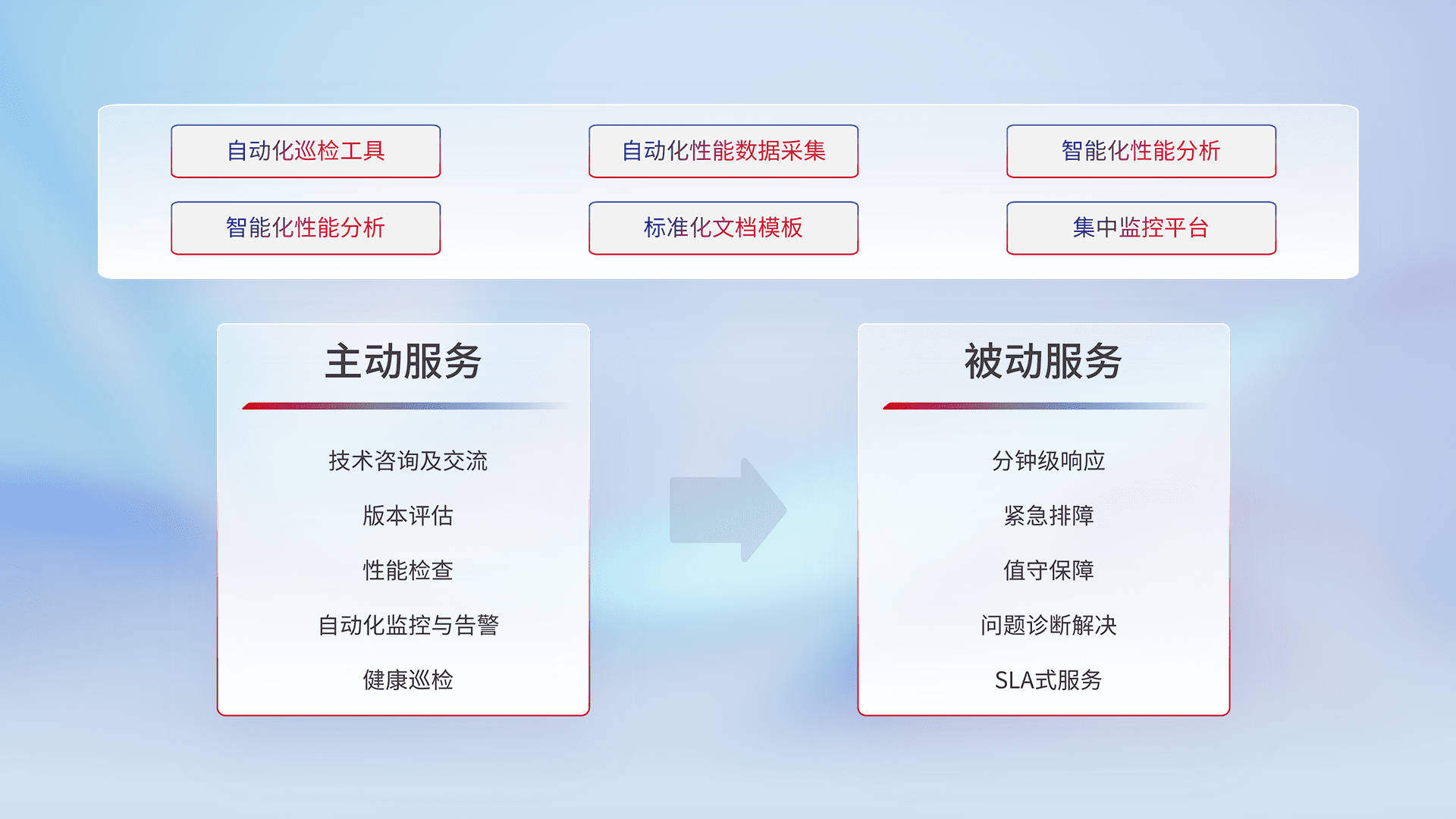 智能化工具和标准化文档,,保障服务质量,,提供主动服务(包含技术咨询、、、、版本评估、、、性能检查、、、、自动化监控与告警、、、健康巡检)和被动服务包含(分钟级响应、、、、紧急排障、、、、值守保障、、、、问题诊断解决、、SLA服务)。。